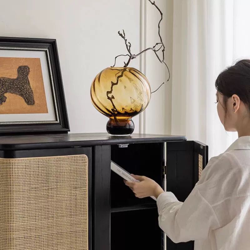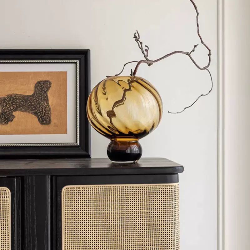 Elevate your space with the timeless beauty of this amber swirl art glass vase. Handcrafted with exquisite detail, it features flowing golden-brown patterns that dance across its rounded form, creating a striking play of light and depth.