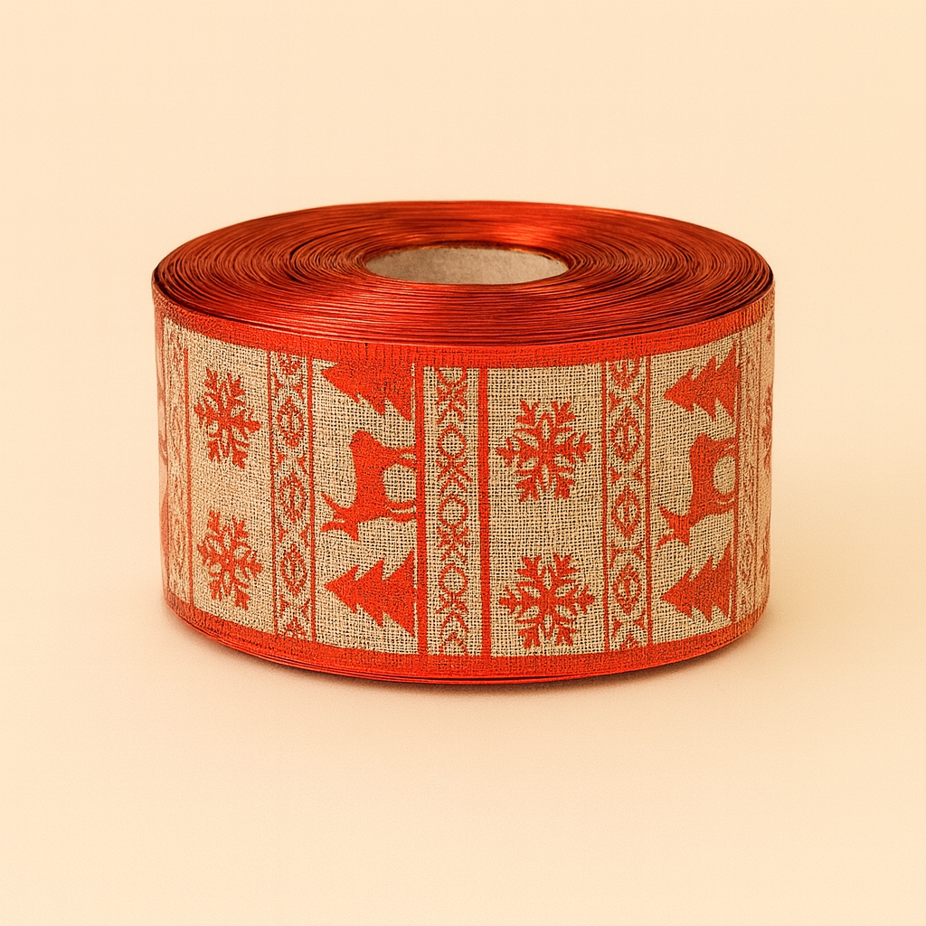 A festive Christmas ribbon with vibrant red patterns—perfect for wrapping gifts, decorating trees, and adding a holiday touch to any space.