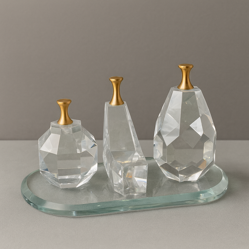 A luxurious crystal décor set featuring faceted geometric shapes with elegant gold accents—perfect for adding sophistication to any space.