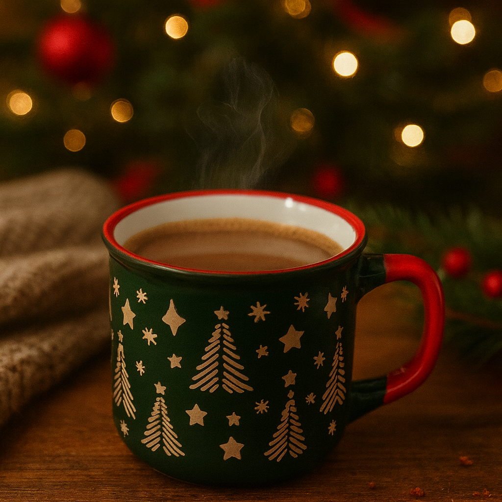 Cozy winter vibes with classic Christmas mugs, perfect for hot drinks and festive evenings.