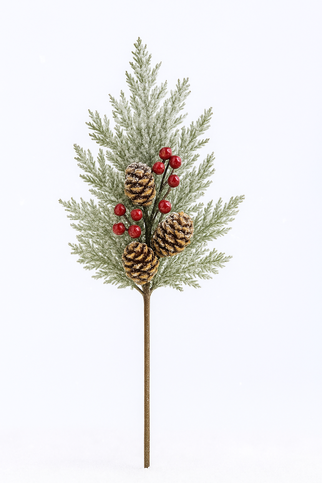A beautifully detailed frosted pine branch featuring natural cones and red berries, softly dusted with snow for a warm festive feel. Perfect for styling Christmas trees, tables, or winter floral arrangements