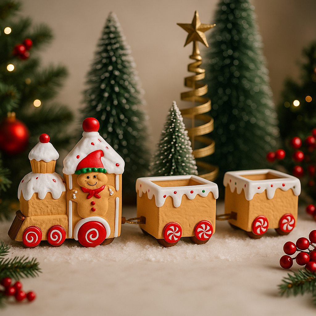 A charming gingerbread-style Christmas train, made of 3 pieces that can be used as décor or for holding small items, adding a warm festive touch to your holiday setup