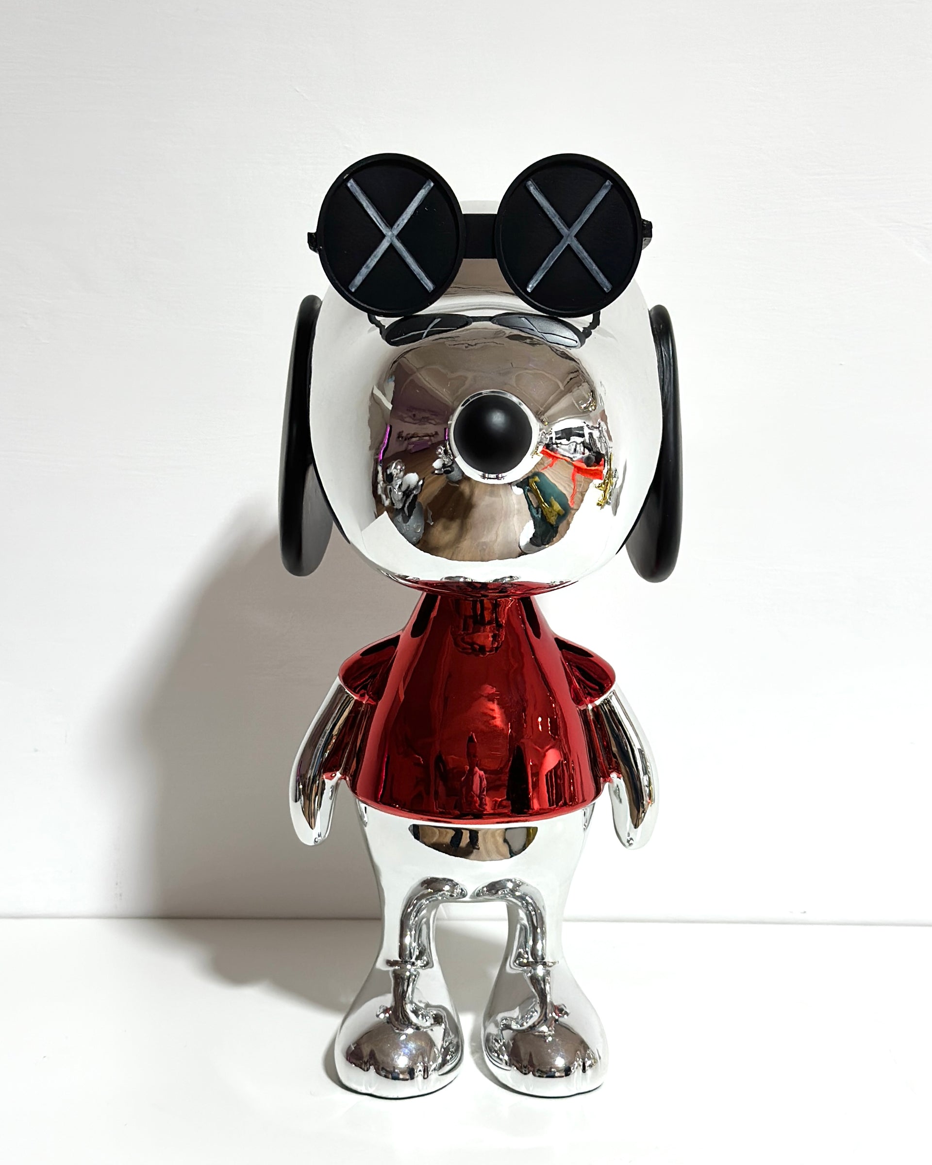 A shiny playful figurine with bold goggles, perfect for adding a modern artistic touch.